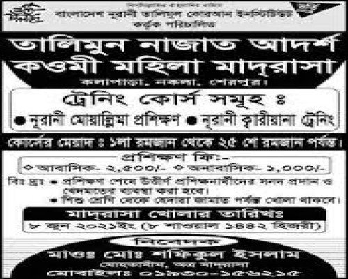 | আলেমা মর্জিনা খাতুন | শামছুল আলম আকন্দ, বরকুল মহিলা মাদরাসা,বরমী, শ্রীপুর, গাজীপুর। | সহকারী প্রশিক্ষিকা |