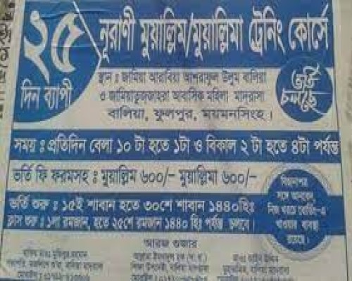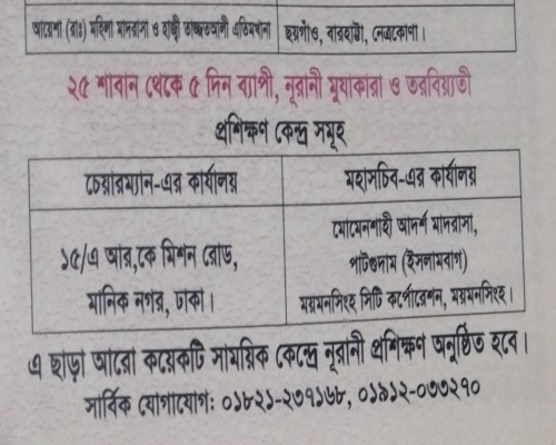 | আলেমা তাজকিয়া জান্নাত শিফা | শিক্ষিকা, মোনেনশাহী আদর্শ মহিলা মাদরাসা, এলজিইডি ভবনের বিপরীতে মসজিদ গেইট, মহানগর, ময়মনসিংহ । | প্রশিক্ষিকা |